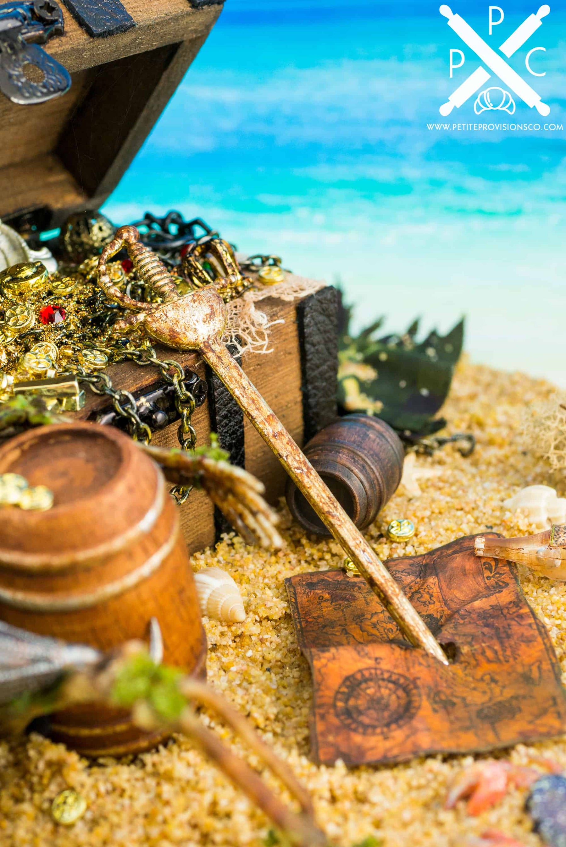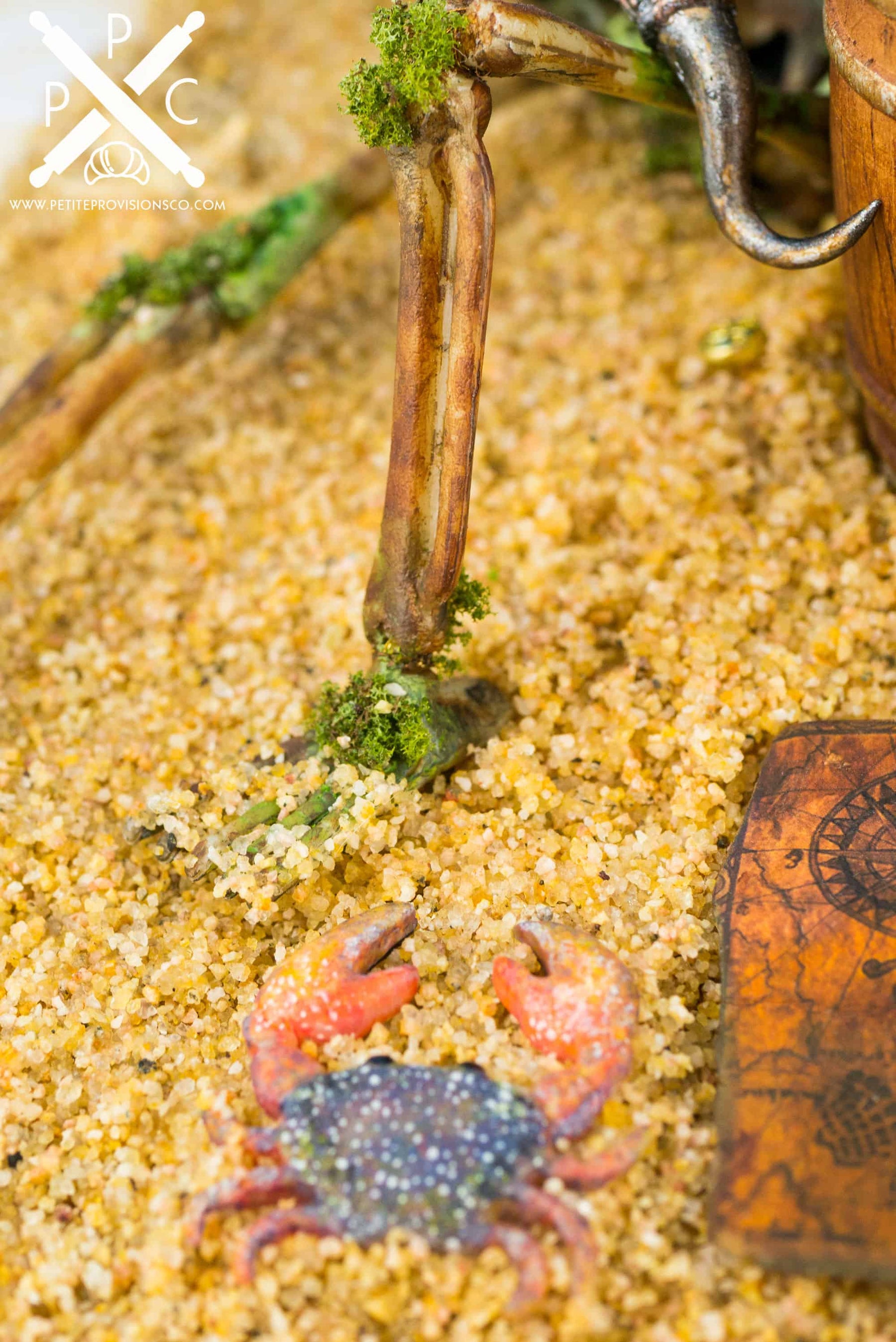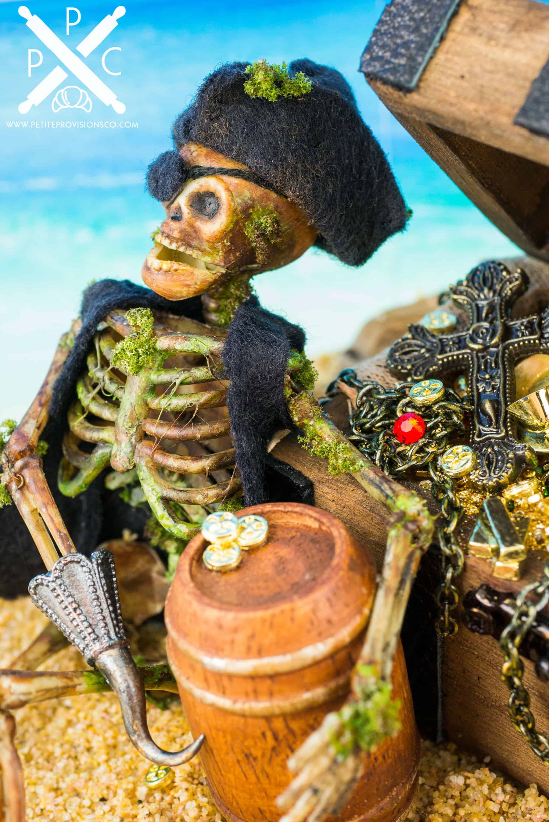 This project has been in the works for quite some time, and I’m so excited that it’s finally finished! Meet Selwyn Crowley… or what’s left of him. This swashbuckling pirate found his buried treasure, but it cost him his life. Now he’s destined to guard this chest in solitude, with only the sand and sea as companions.