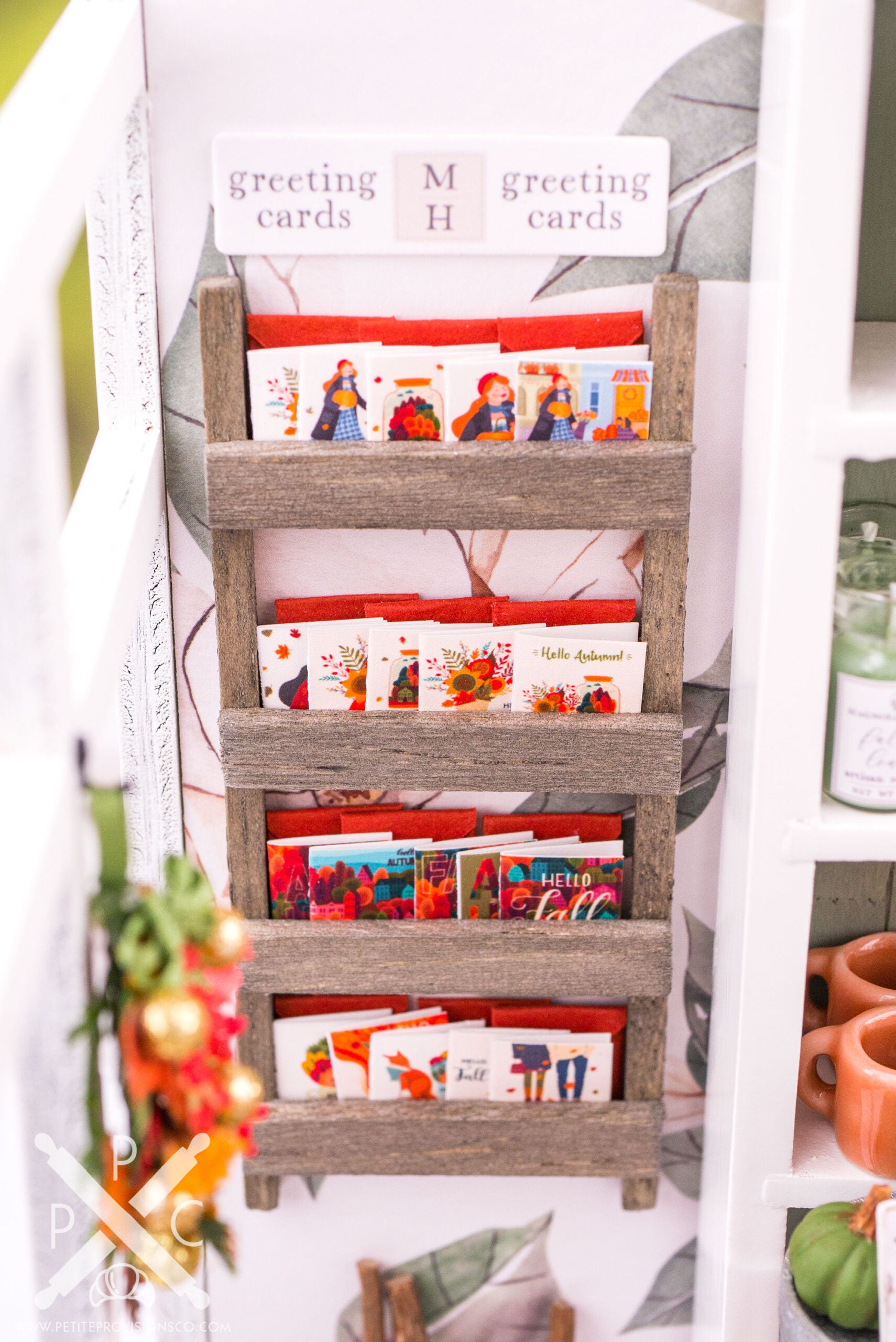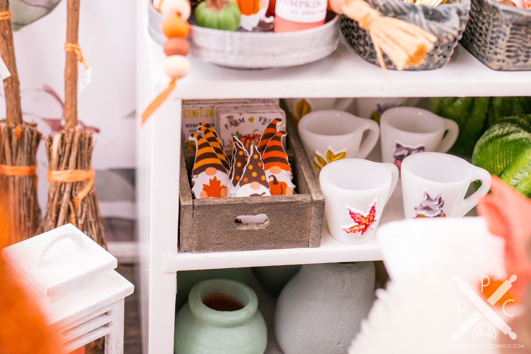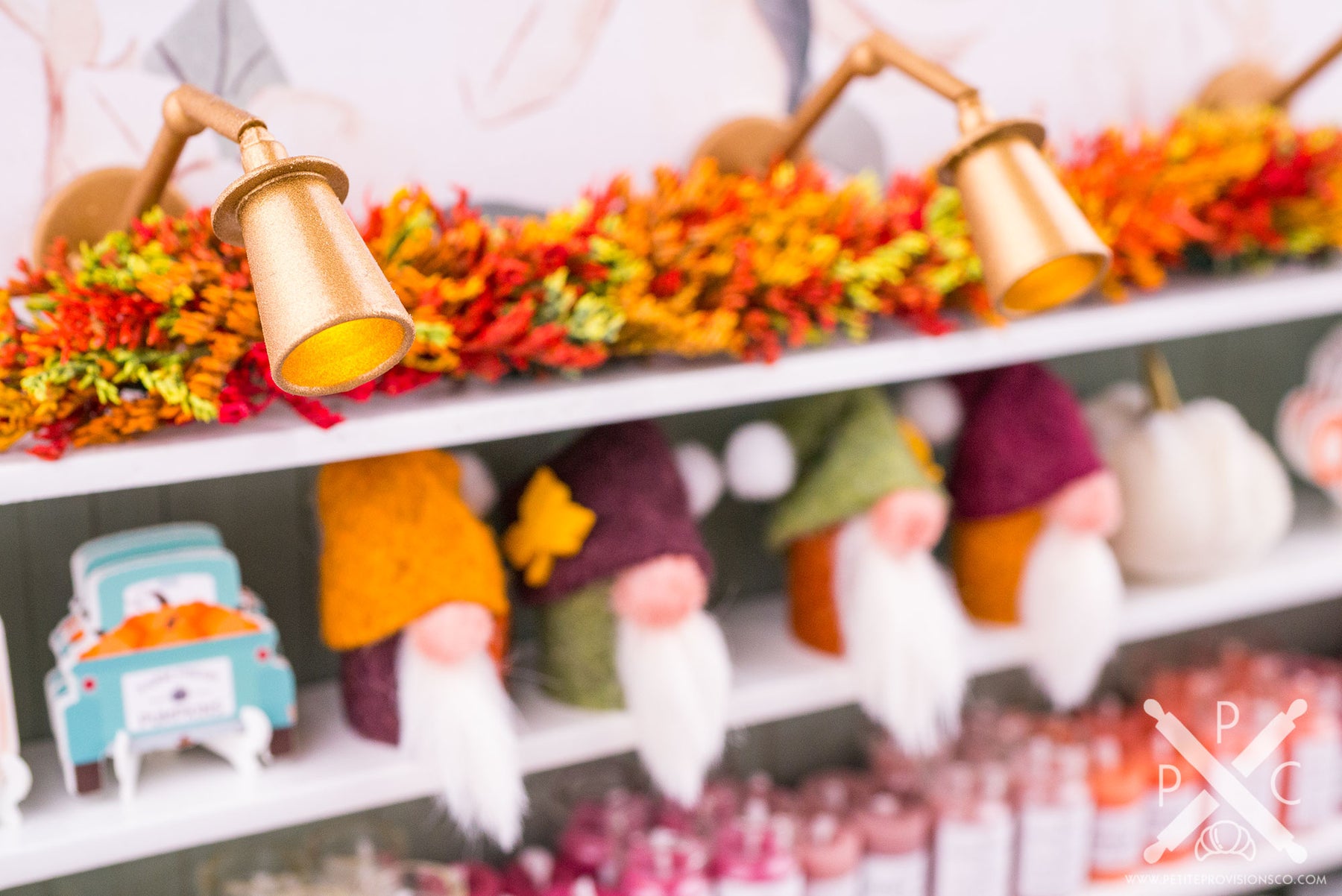 From there, let’s browse the main shelving. At the very top is a beautiful autumn garland by Tiny Naturals Gift Shop, followed by one of my most playful additions to the shop: gnomes. I’ve always loved decorative gnomes at full scale, so making tiny versions for Magnolia Hollow felt like a natural fit.