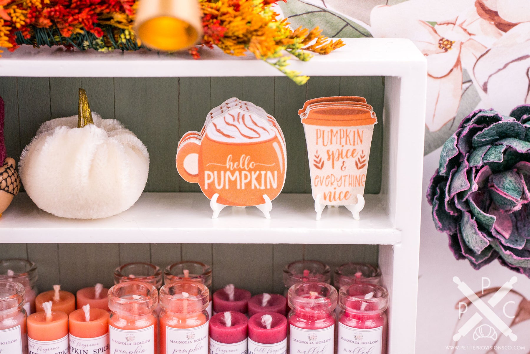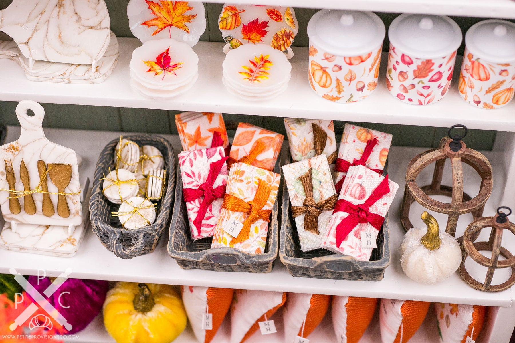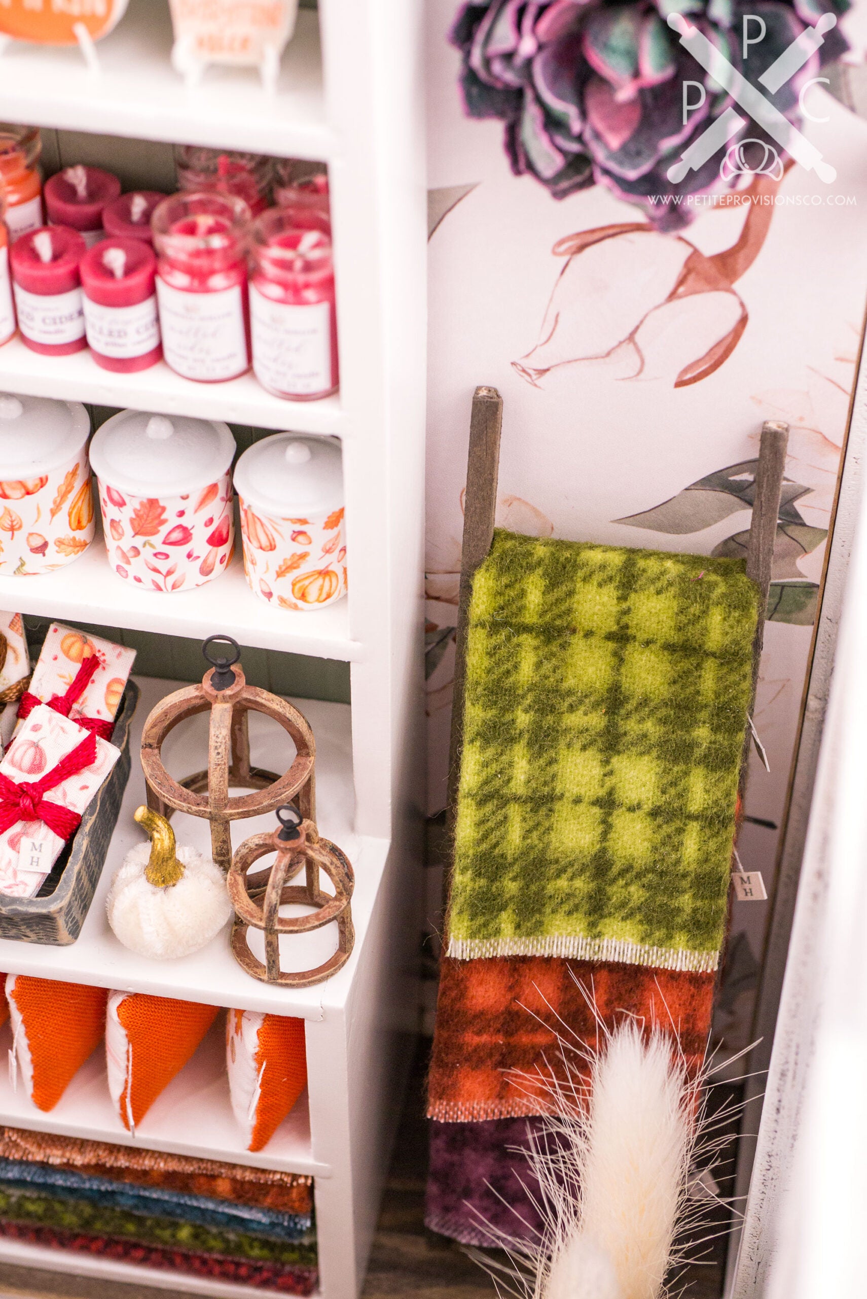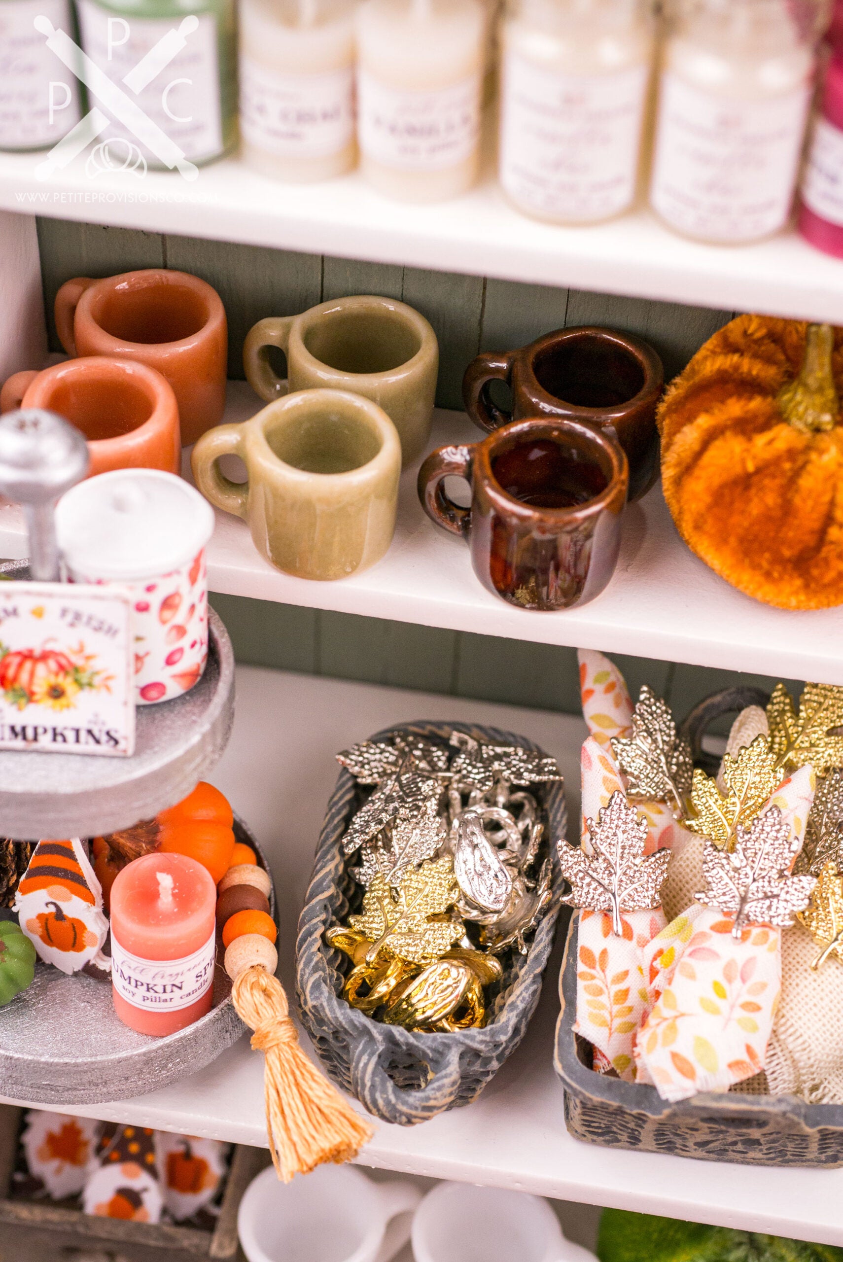 From there, let’s browse the main shelving. At the very top is a beautiful autumn garland by Tiny Naturals Gift Shop, followed by one of my most playful additions to the shop: gnomes. I’ve always loved decorative gnomes at full scale, so making tiny versions for Magnolia Hollow felt like a natural fit.
