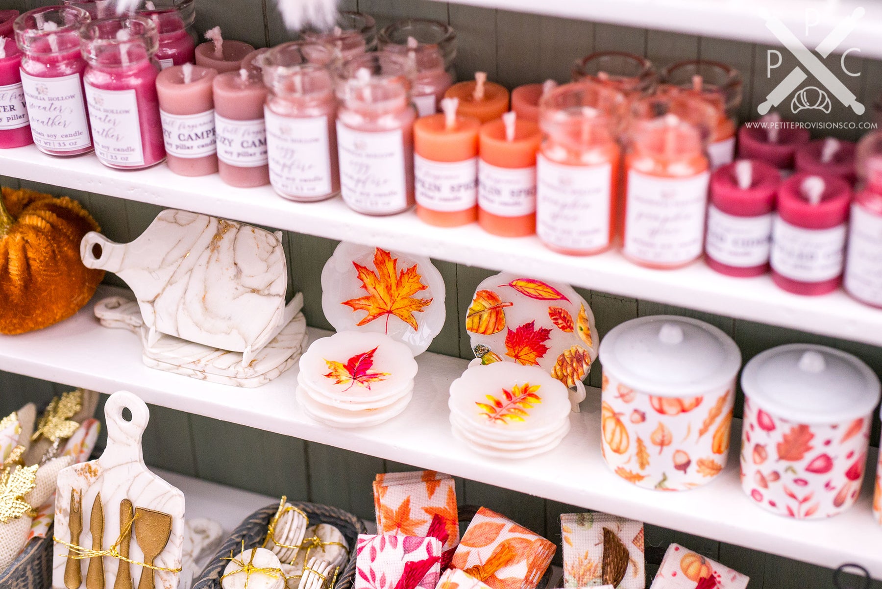 Somewhere along the way, I went a little overboard making candles, but they were just too much fun to stop. They’re all poured wax and actually functional, which makes them even more special. I also made additional plates, decorated the canisters, and created the white-and-gold marble cheeseboards and coasters. These are made from polymer clay with real gold leaf, and the cheese knives were cut with my Cricut. Those subtle metallic details are some of my favorites in the entire shop.