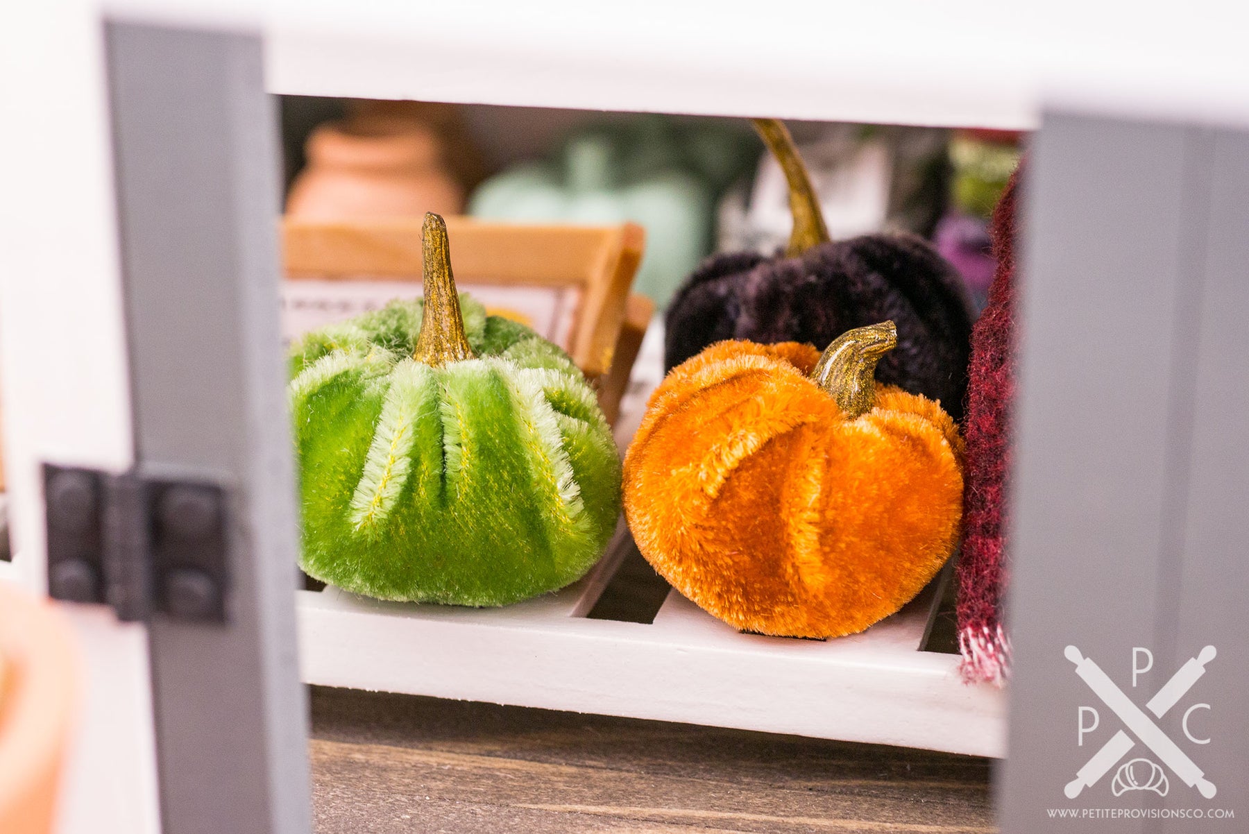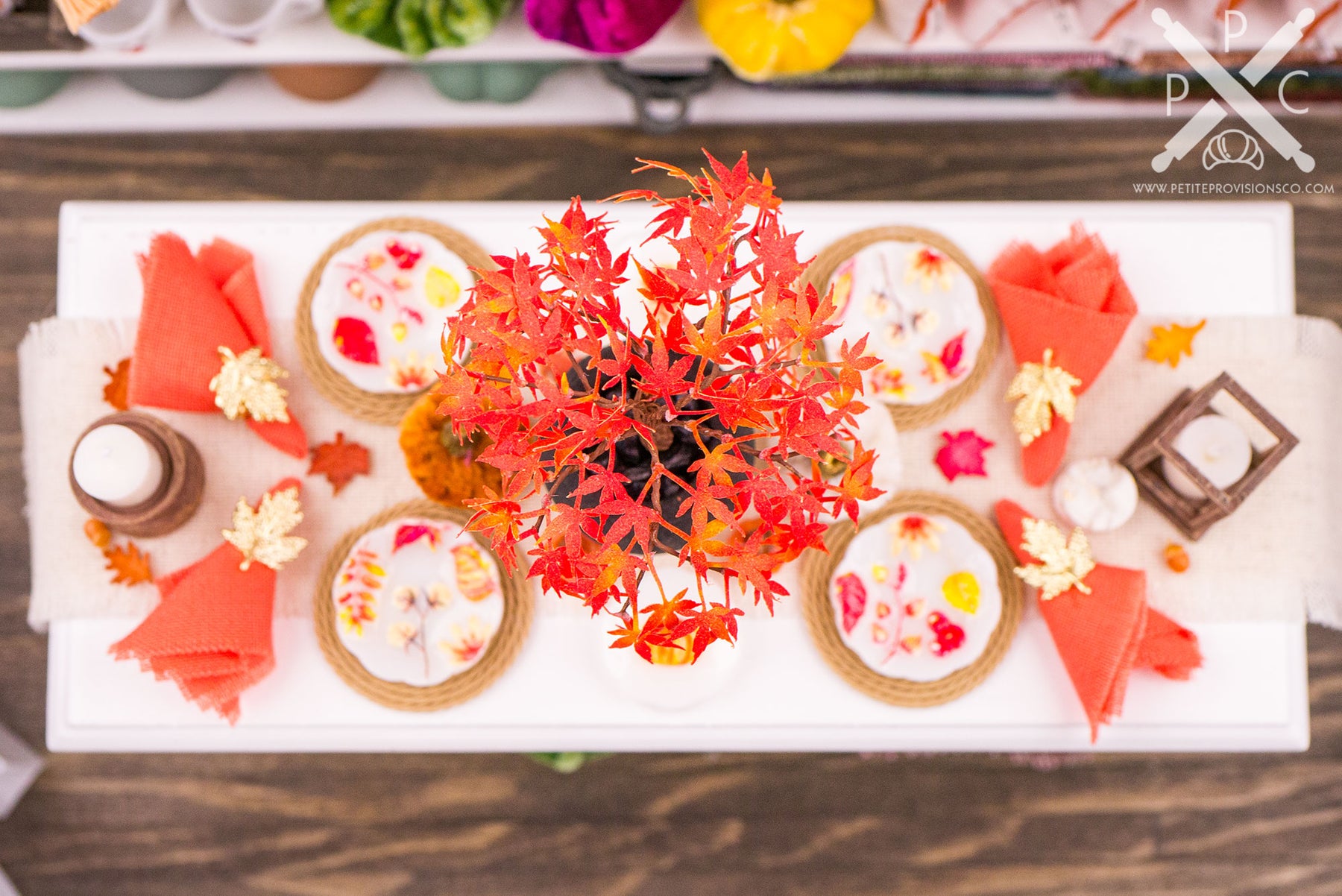 Surrounding the table are layers of cozy, seasonal details. The square lantern and pedestal candle holder are from Giulia’s Miniatures, while the rest of the styling is handmade. I created the chargers, leaf napkin rings, marble coasters, velvet pumpkins, and pumpkin salt and pepper shakers, and I decorated all of the plates as well. I love how these pieces work together to feel warm without being overly busy.