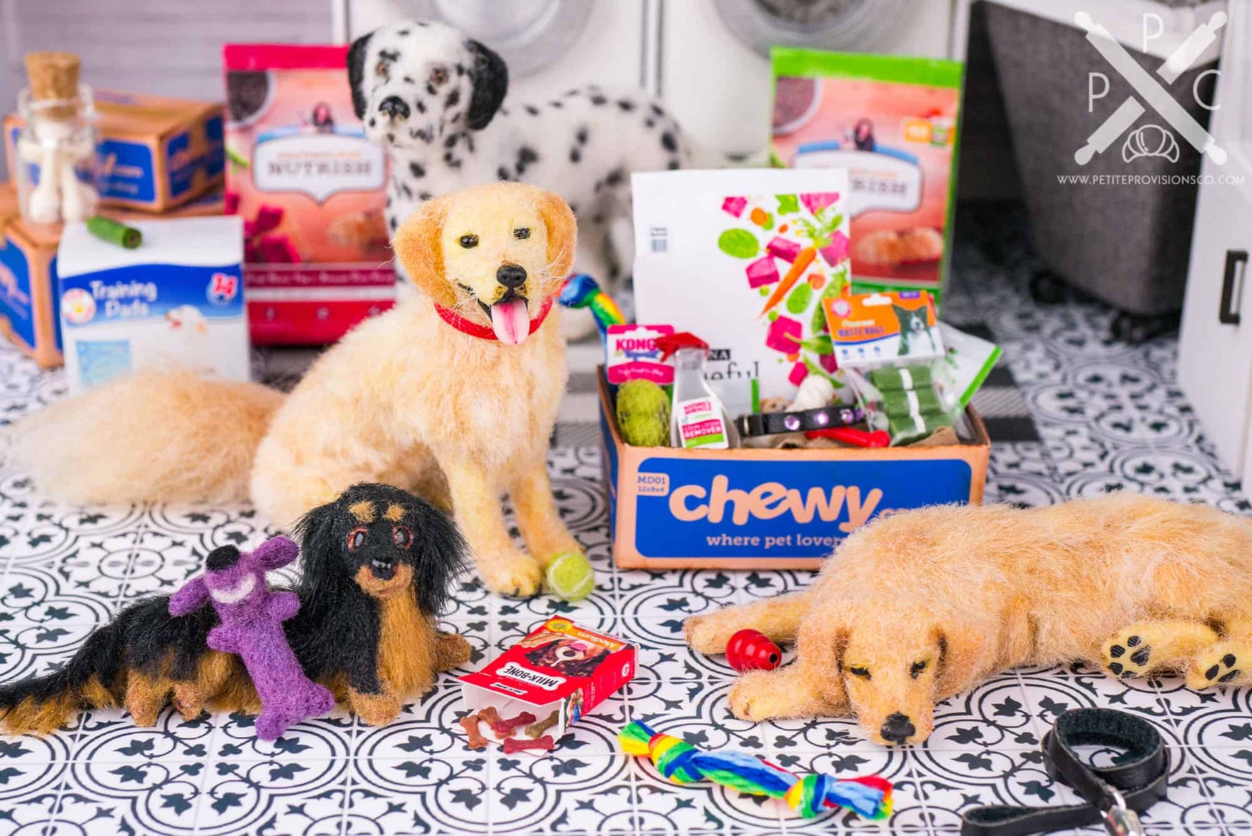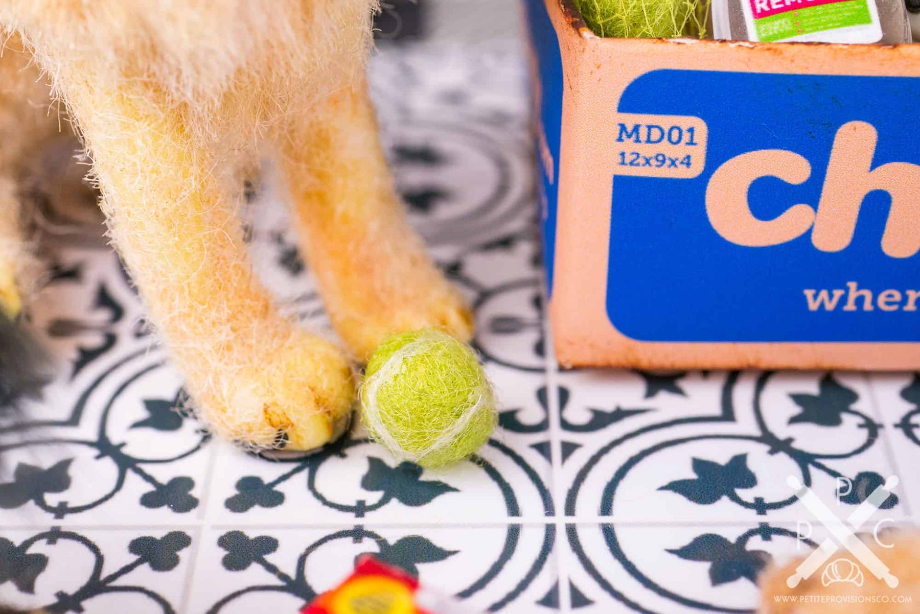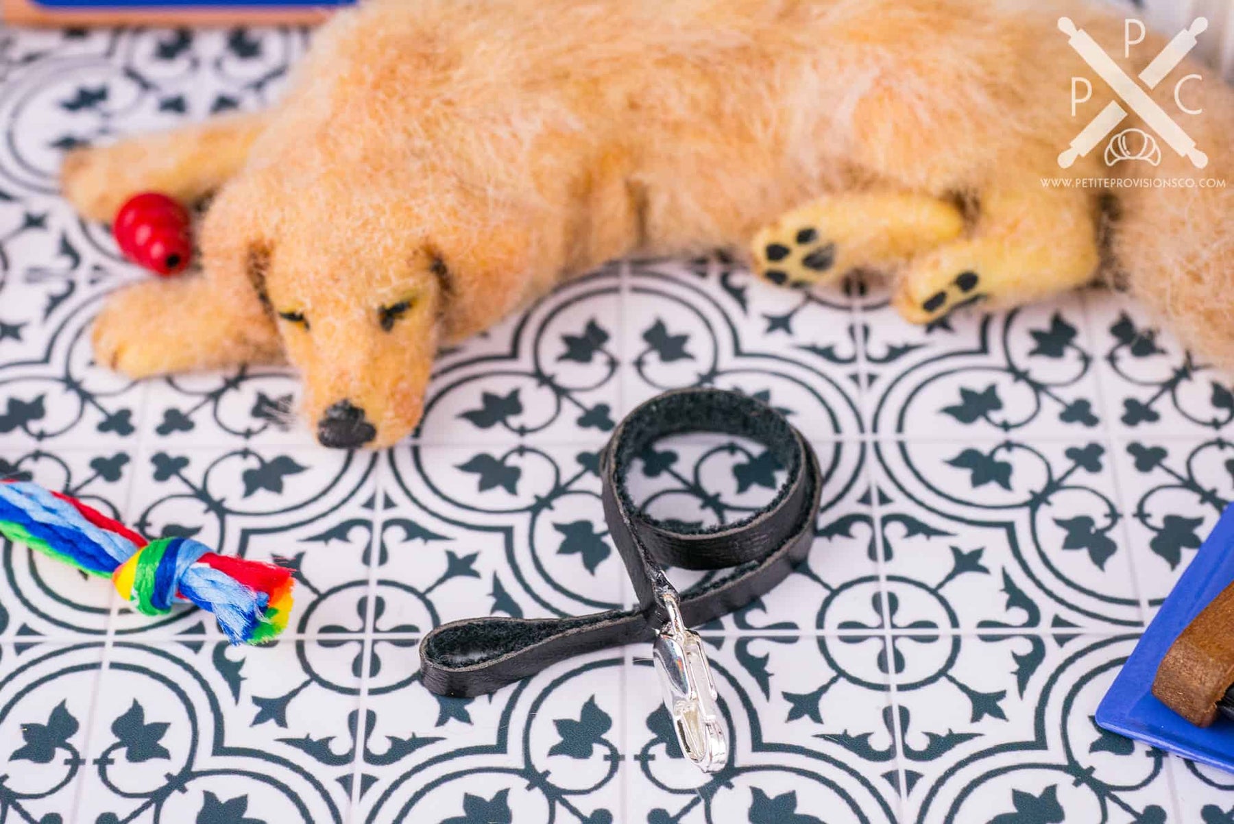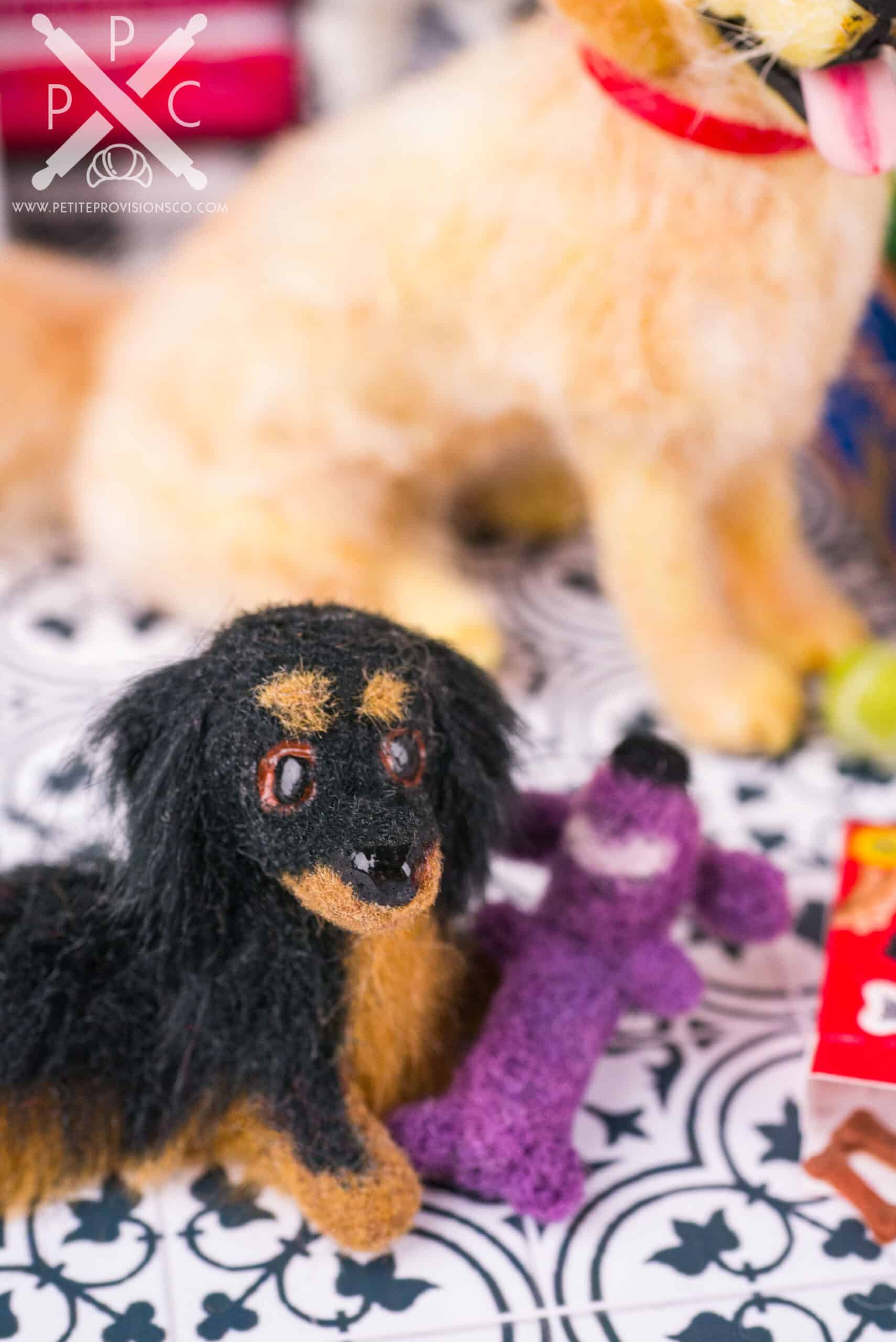 This project gave me the perfect excuse to dive into making some classic dog toys in miniature. I loved recreating a mix of familiar favorites and handmade pieces to bring the scene to life. My personal favorite is the needle-felted Loofa-style dog toy, inspired by one my dog Logan adored as a puppy. I also needle felted a tiny tennis ball, which felt like a must for any dog-themed setup.