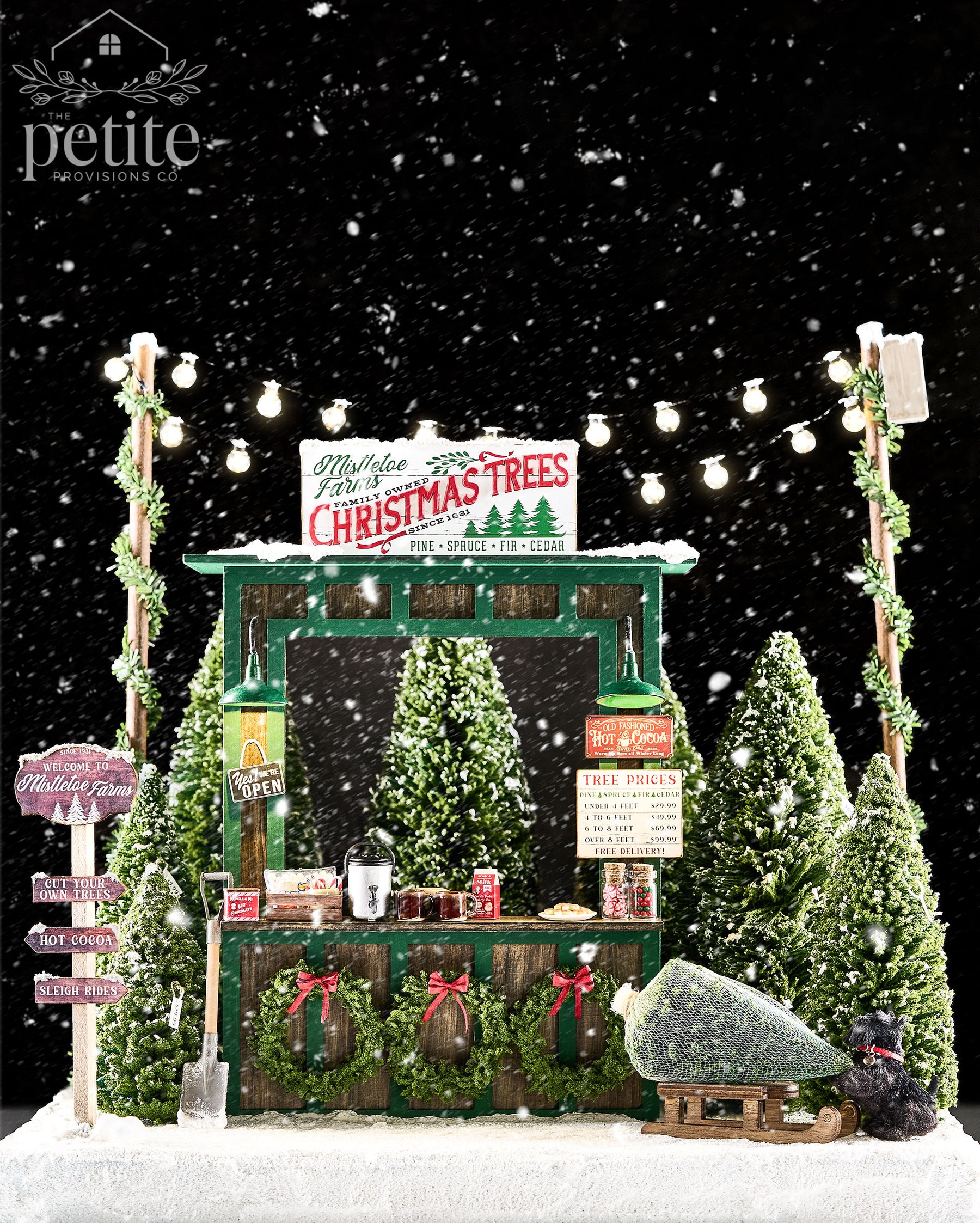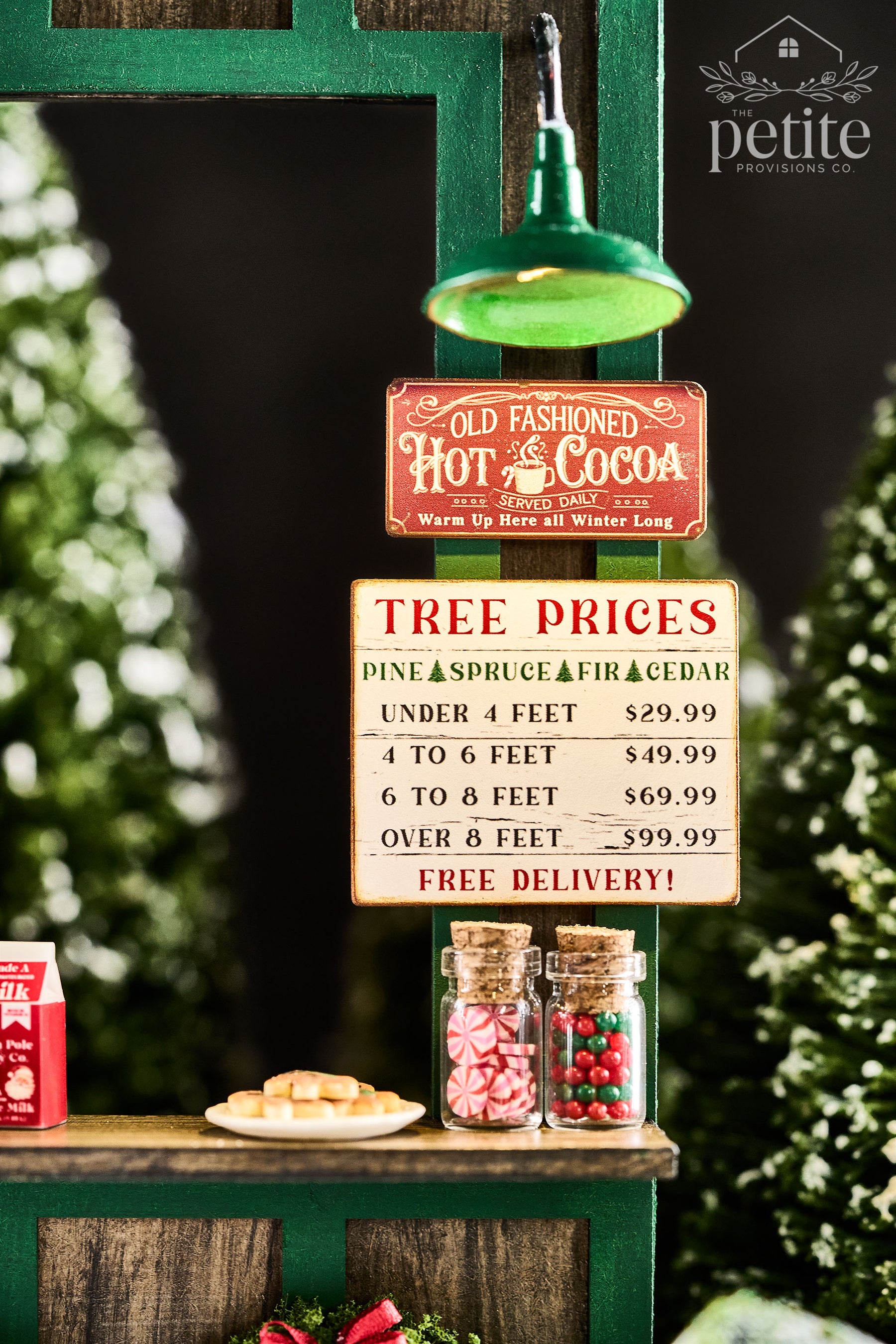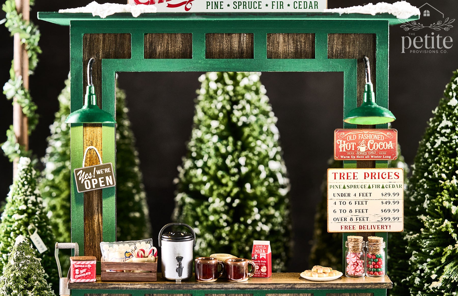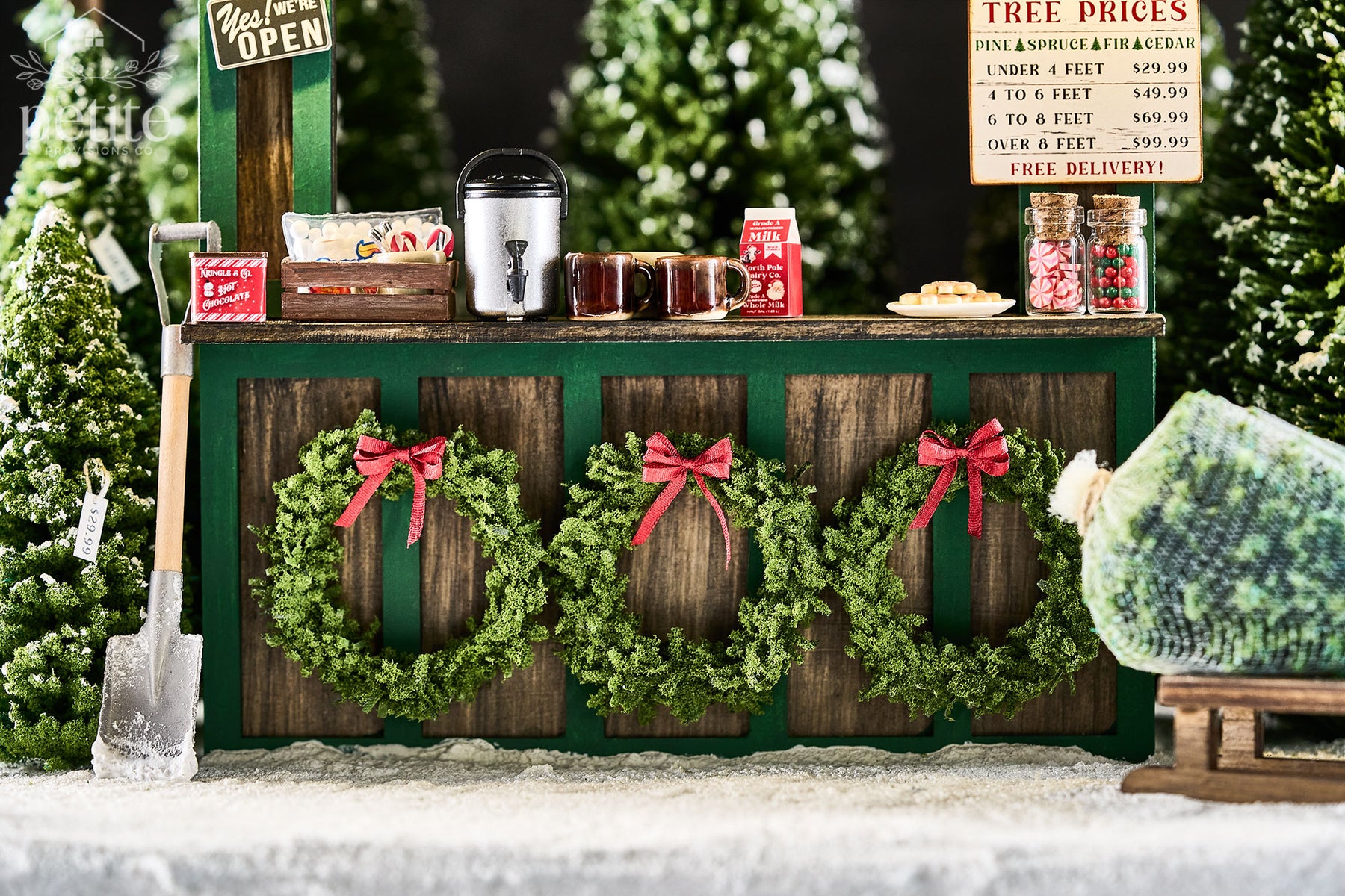 My miniature Christmas tree stand is inspired by old-fashioned tree lots. It shimmers under a dusting of faux snow, and tiny strings of lights cast a warm glow. A quaint hot cocoa bar, complete with marshmallows and peppermint candies, adds a touch of whimsy. I really hope I captured the magic of the holiday season in miniature form!