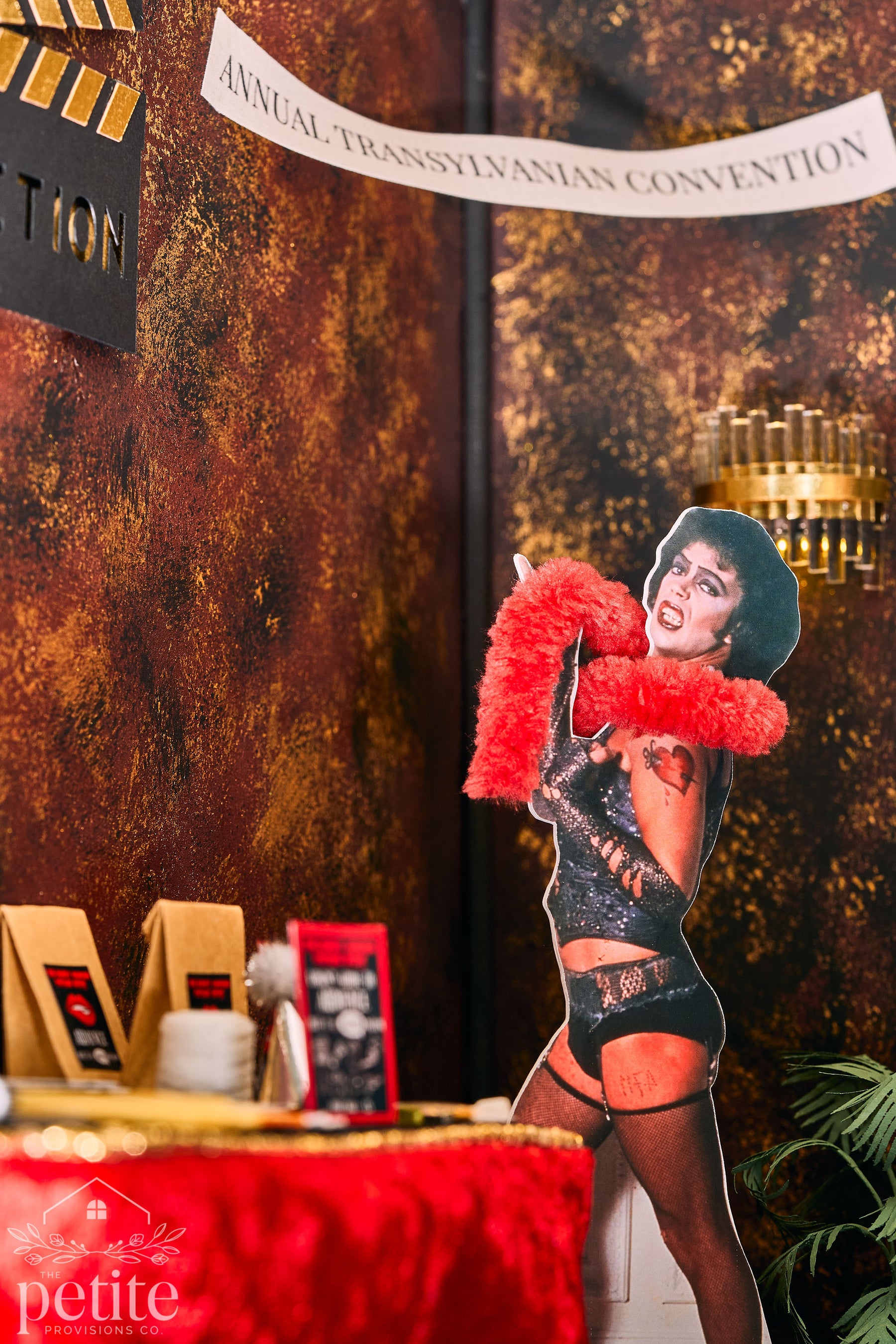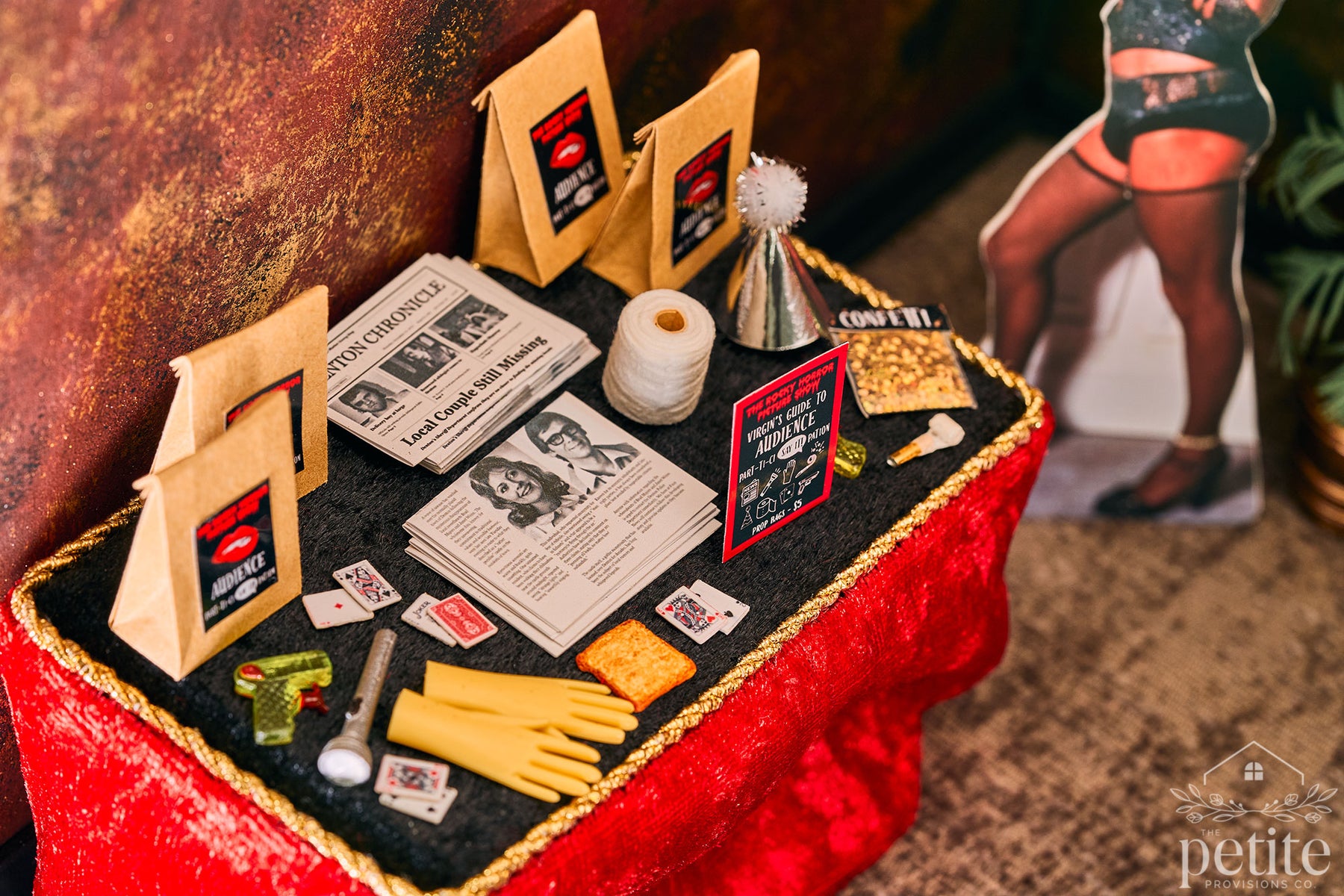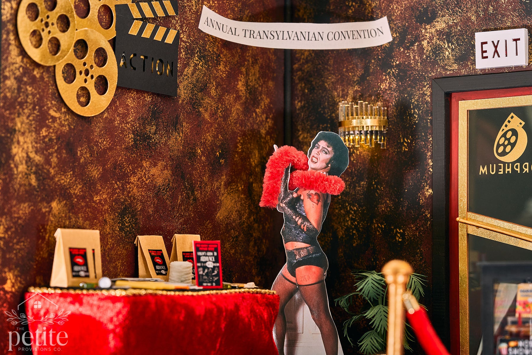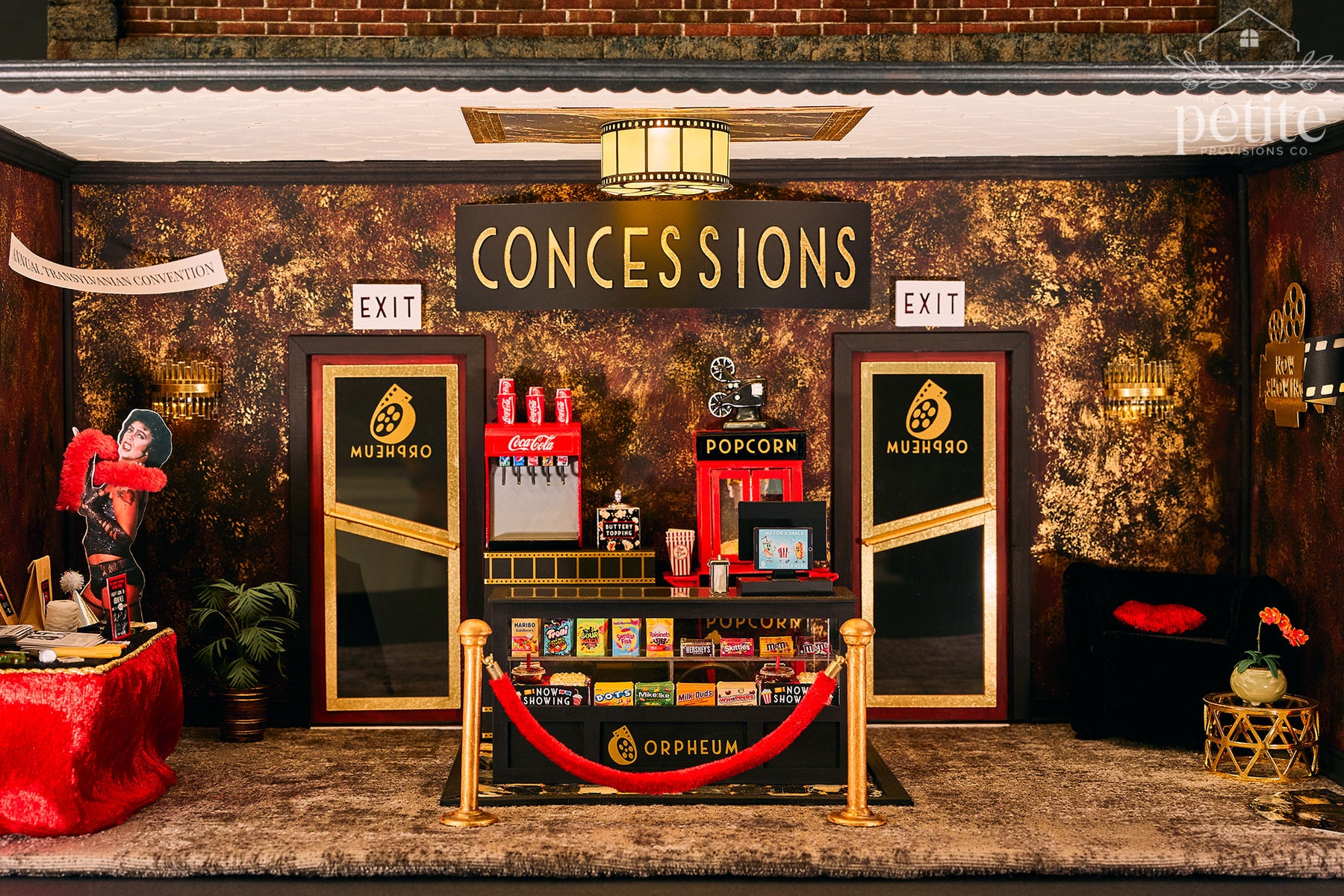 Turning the theater around reveals the lobby: a lush red, gold, and black Art Deco space with a fully stocked concessions stand (popcorn, candy, soda) and a velvet armchair crowned by a red lips-shaped pillow. A life-size standee of Tim Curry as Dr. Frank-N-Furter invites photo ops for movie-goers, while a small table sells Audience Participation kits filled with every delightfully chaotic prop a Rocky Horror veteran could want - toilet paper, playing cards, flashlights, squirt guns, toast, newspapers, and more.