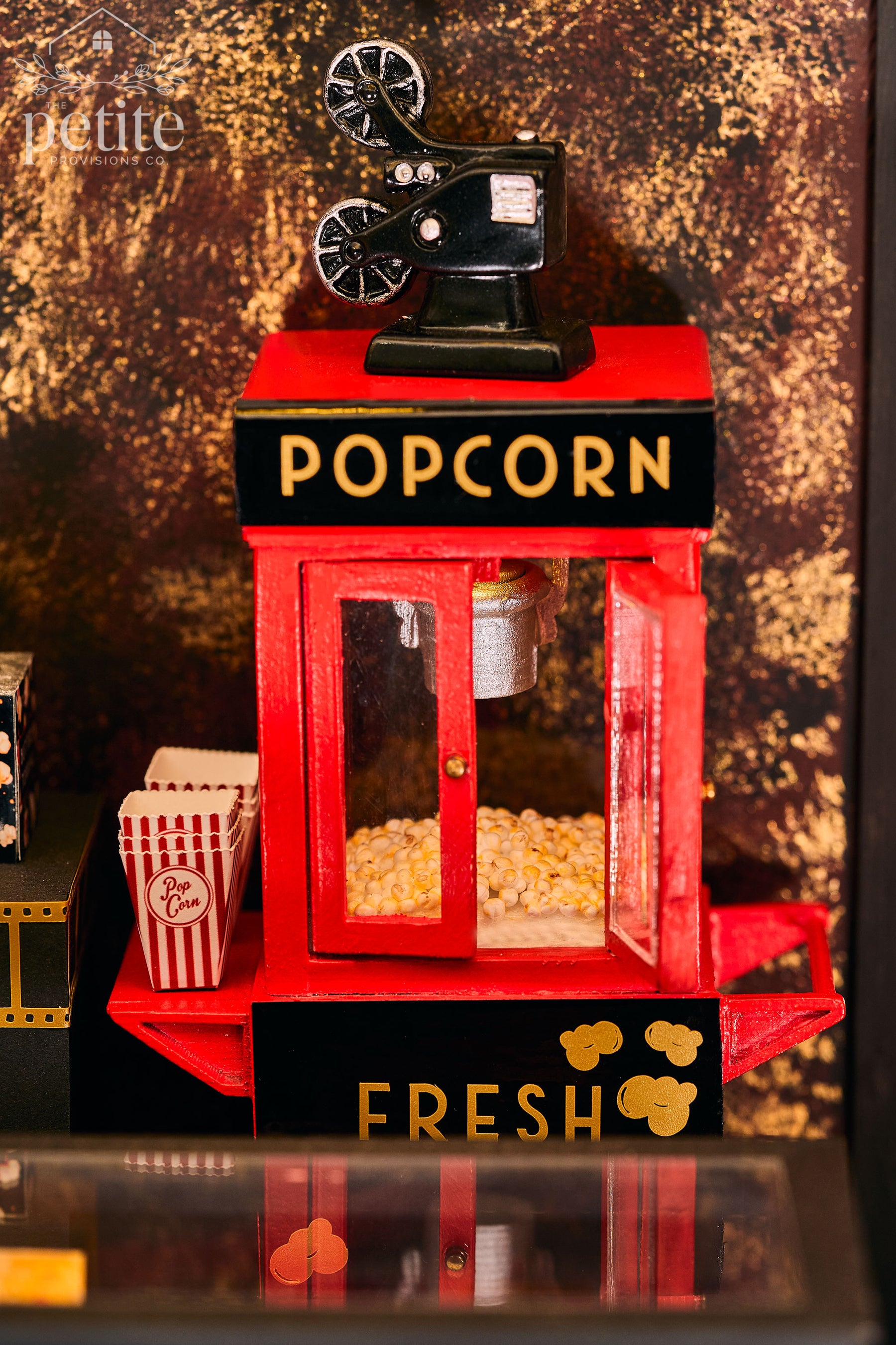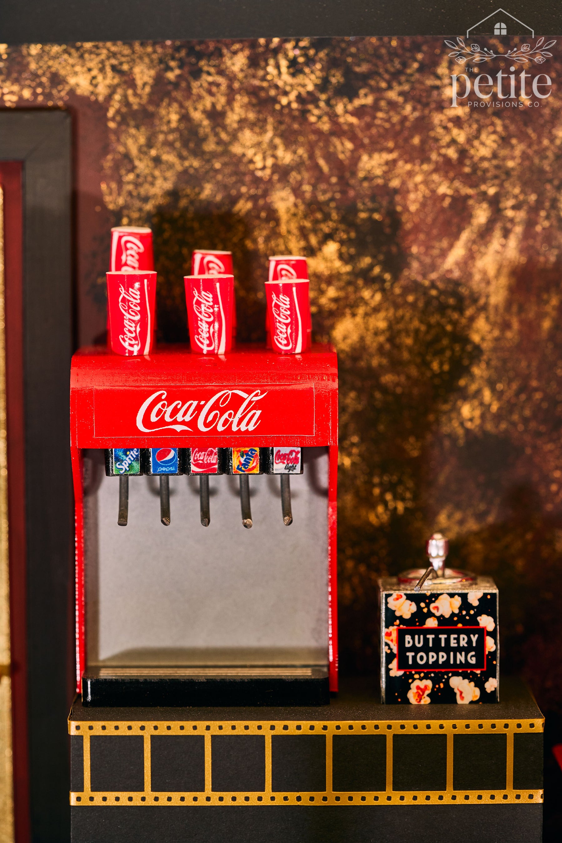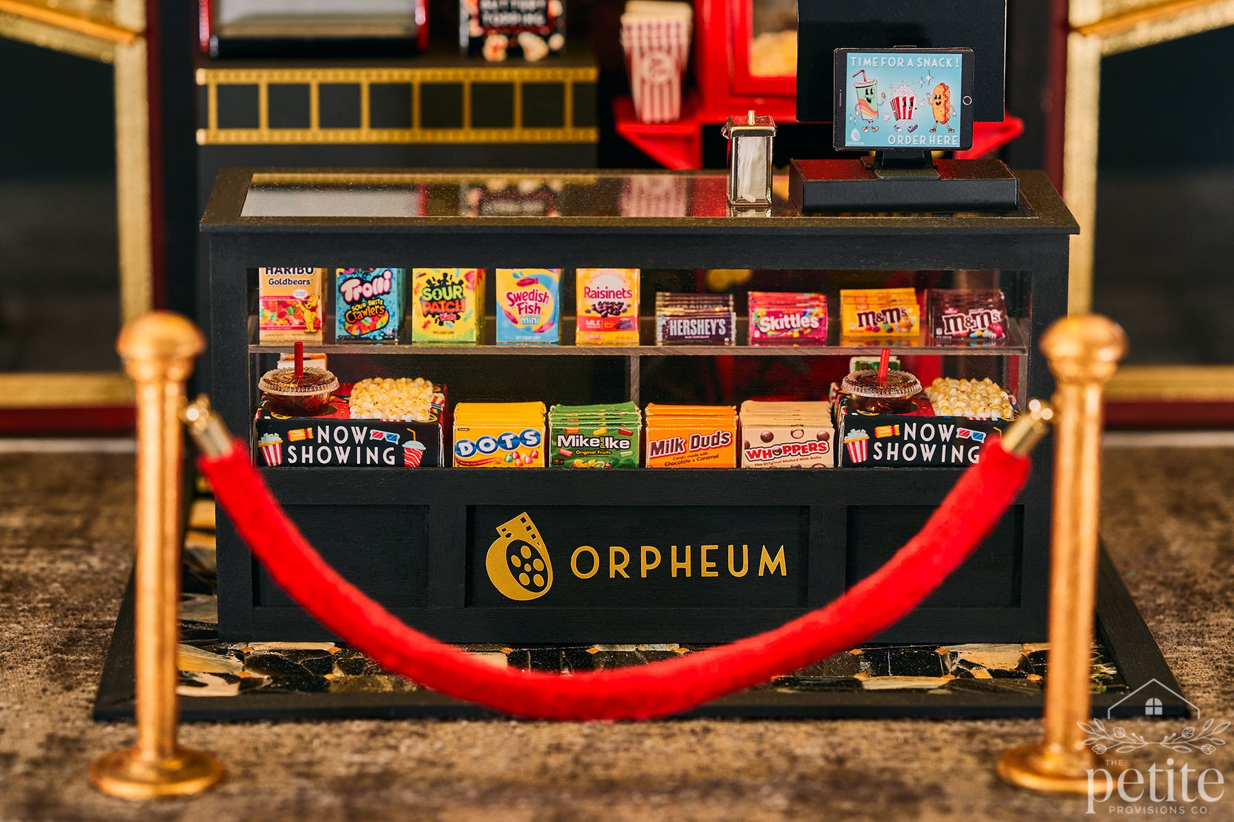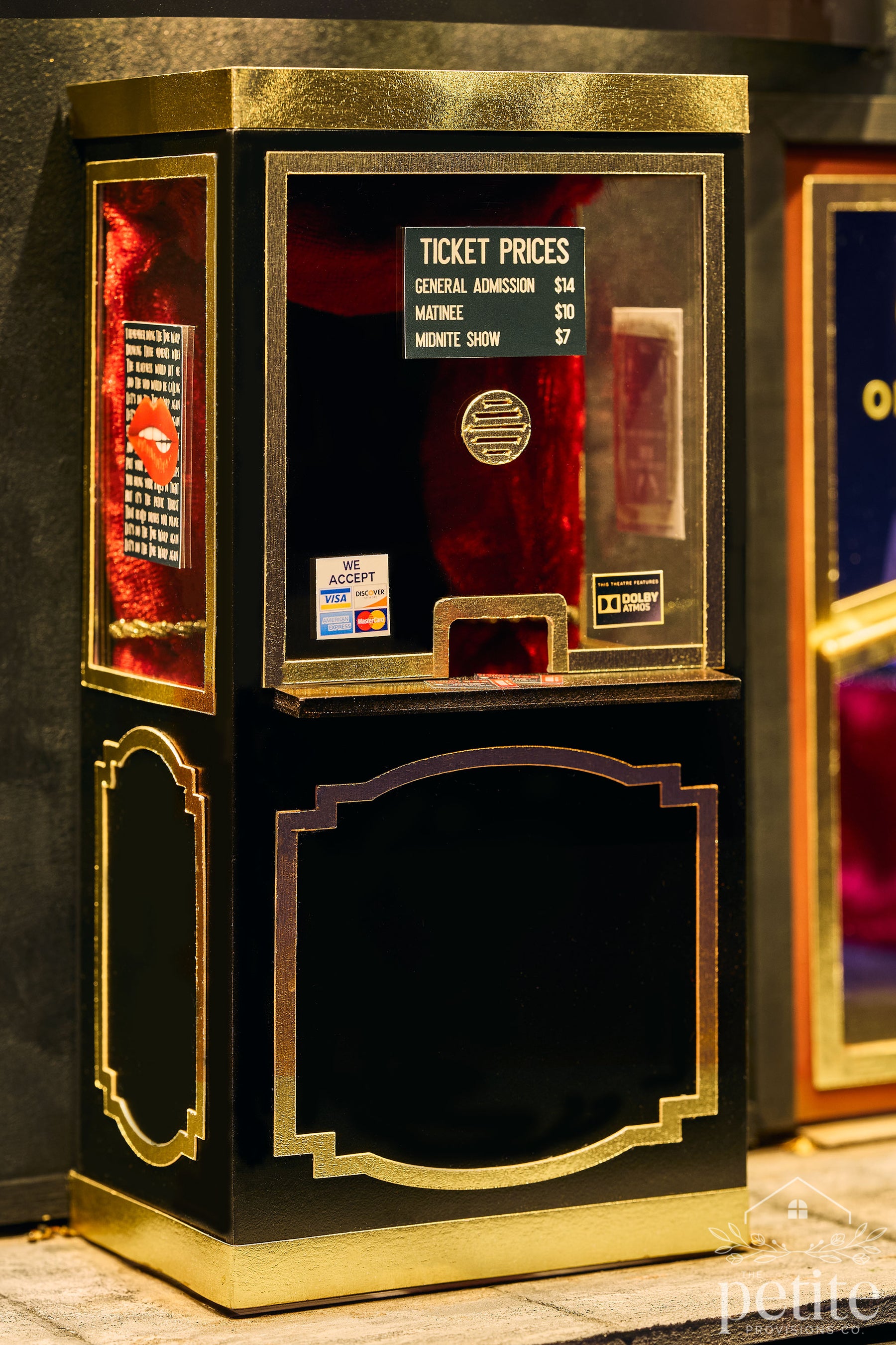 Turning the theater around reveals the lobby: a lush red, gold, and black Art Deco space with a fully stocked concessions stand (popcorn, candy, soda) and a velvet armchair crowned by a red lips-shaped pillow. A life-size standee of Tim Curry as Dr. Frank-N-Furter invites photo ops for movie-goers, while a small table sells Audience Participation kits filled with every delightfully chaotic prop a Rocky Horror veteran could want - toilet paper, playing cards, flashlights, squirt guns, toast, newspapers, and more.