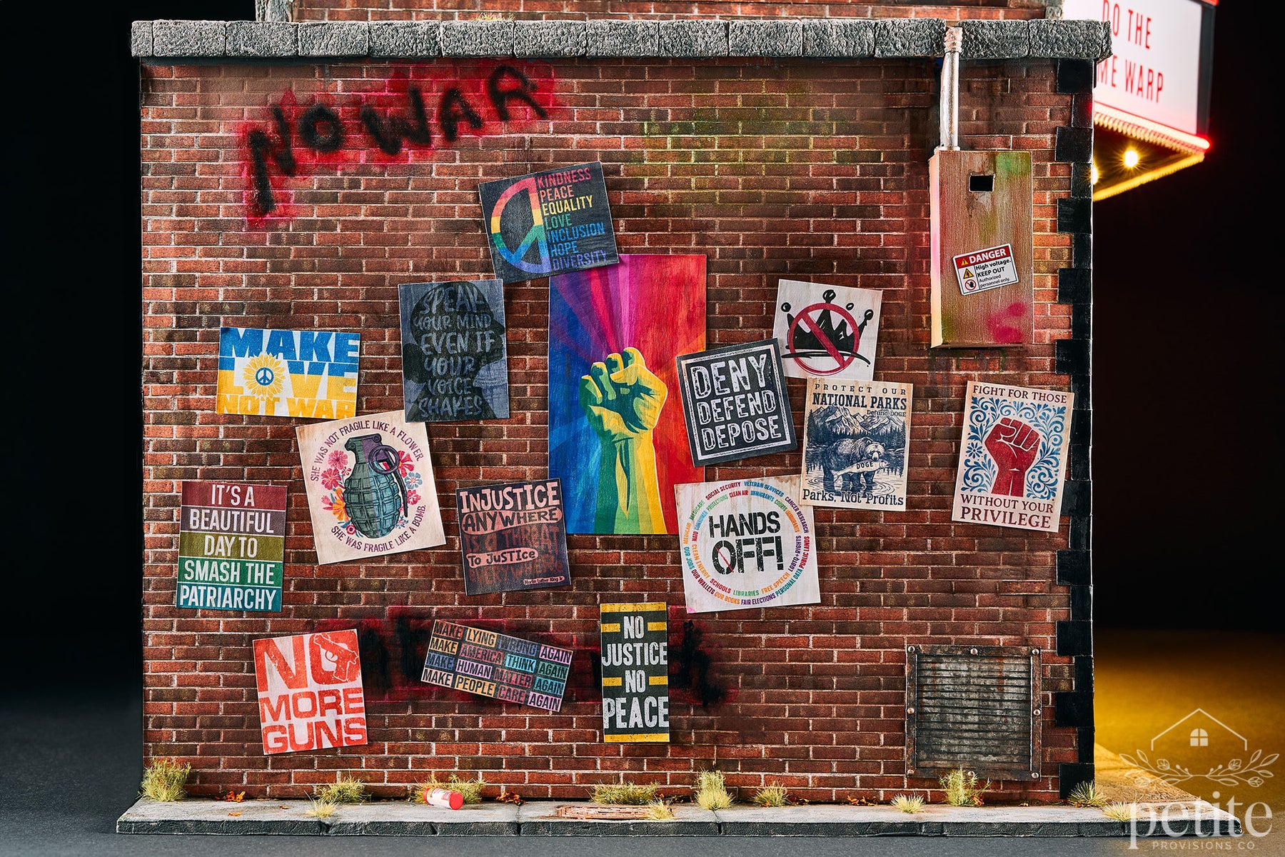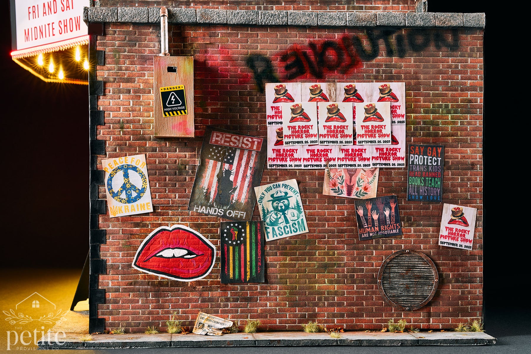 The Orpheum is an old brick movie palace, its façade glowing with lighted marquee signs announcing midnight showings of The Rocky Horror Picture Show. Black, dark red, and gold accents, along with an Art Deco flair, recall the glamour of vintage theaters. But look closer, the brick walls are alive with protest posters, graffiti, and political art. These aren’t just visual details; they’re deliberate echoes of the activism and resistance that Rocky Horror has inspired for generations.