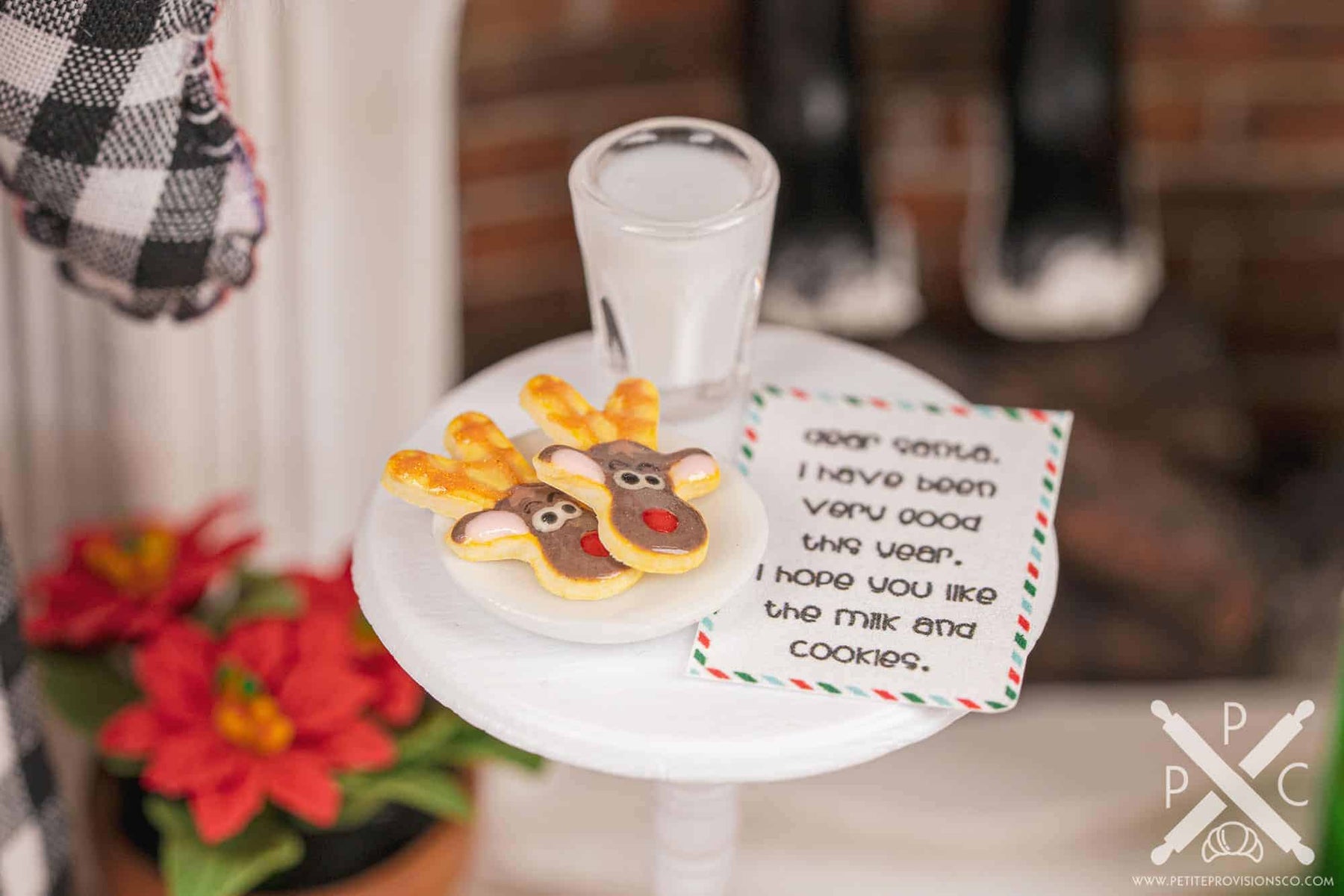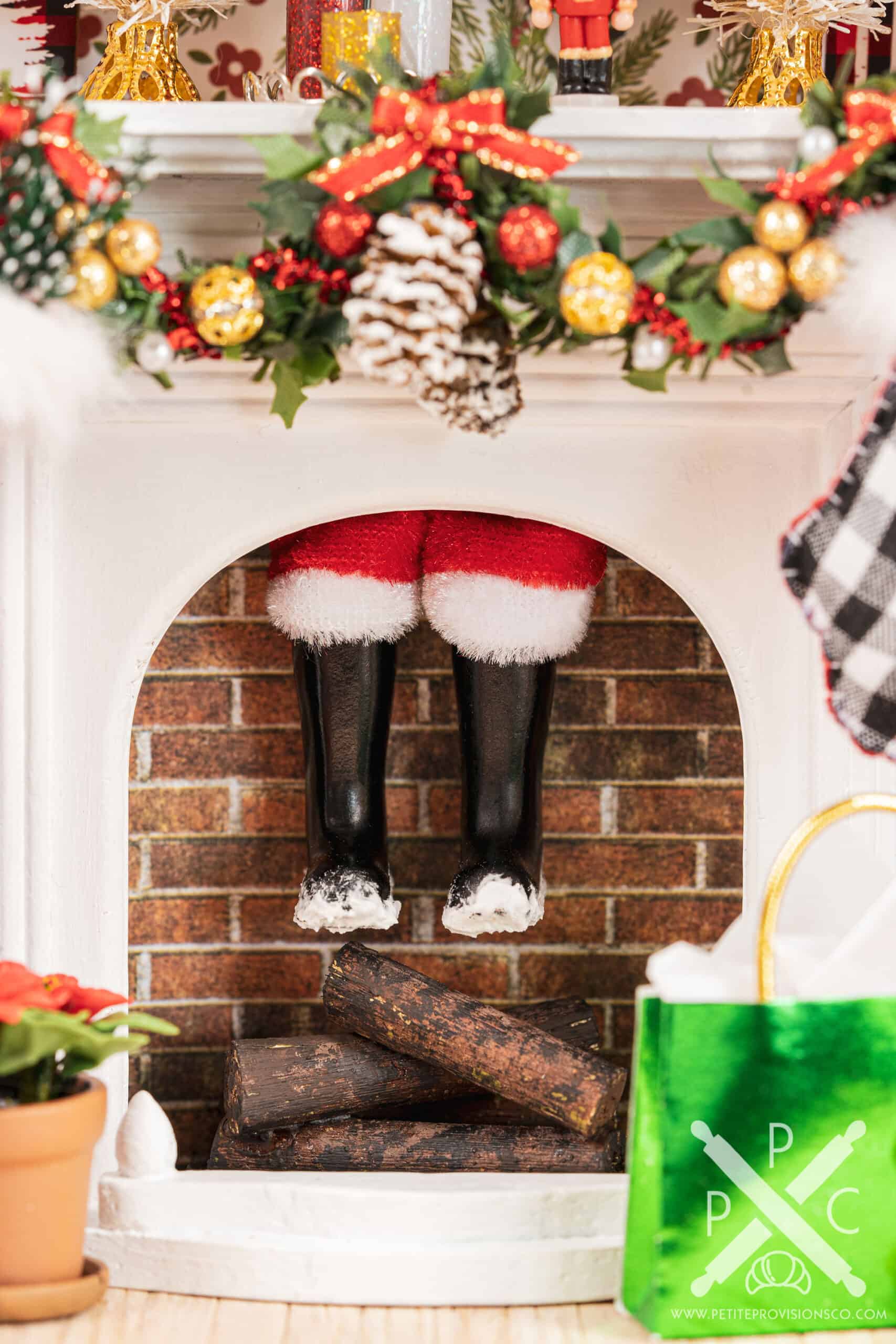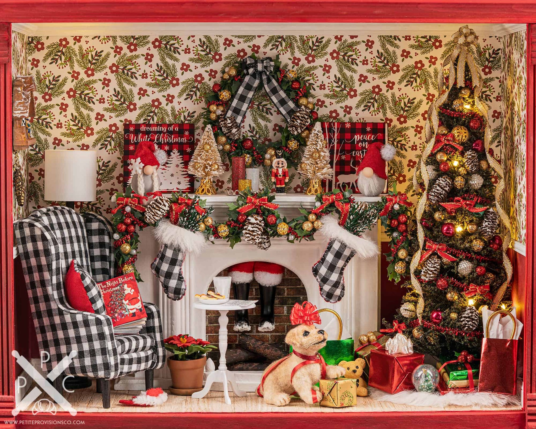 One of my favorite cozy corners in the room features a fully illustrated version of The Night Before Christmas. The chair was built following a tutorial by Bentley House Minis on YouTube, and once I spotted the buffalo check fabric, I knew I wanted to use it for both the stockings and the tree skirt. Tucked behind the chair is a lighted floor lamp, which turned out to be one of the trickiest elements to figure out, but it adds such a warm glow to the scene. And those fuzzy little slippers? Easily one of my favorite details.
