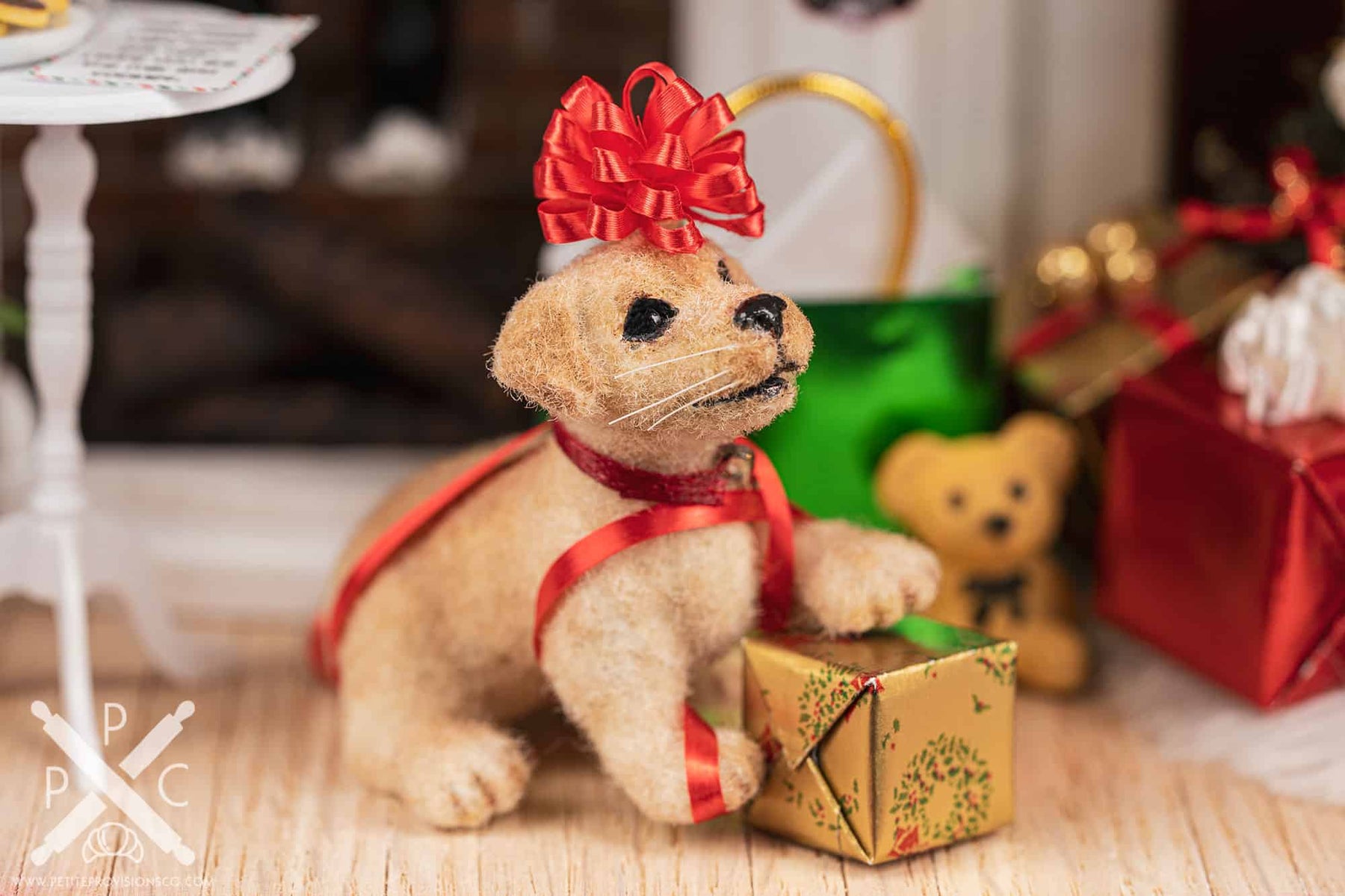 The puppy is an artisan piece that I found secondhand, and I couldn’t resist giving him a little extra personality. I added the ribbon wrapped around his body and the bow on his head, which really helps sell the idea that he’s been “helping” with the presents.