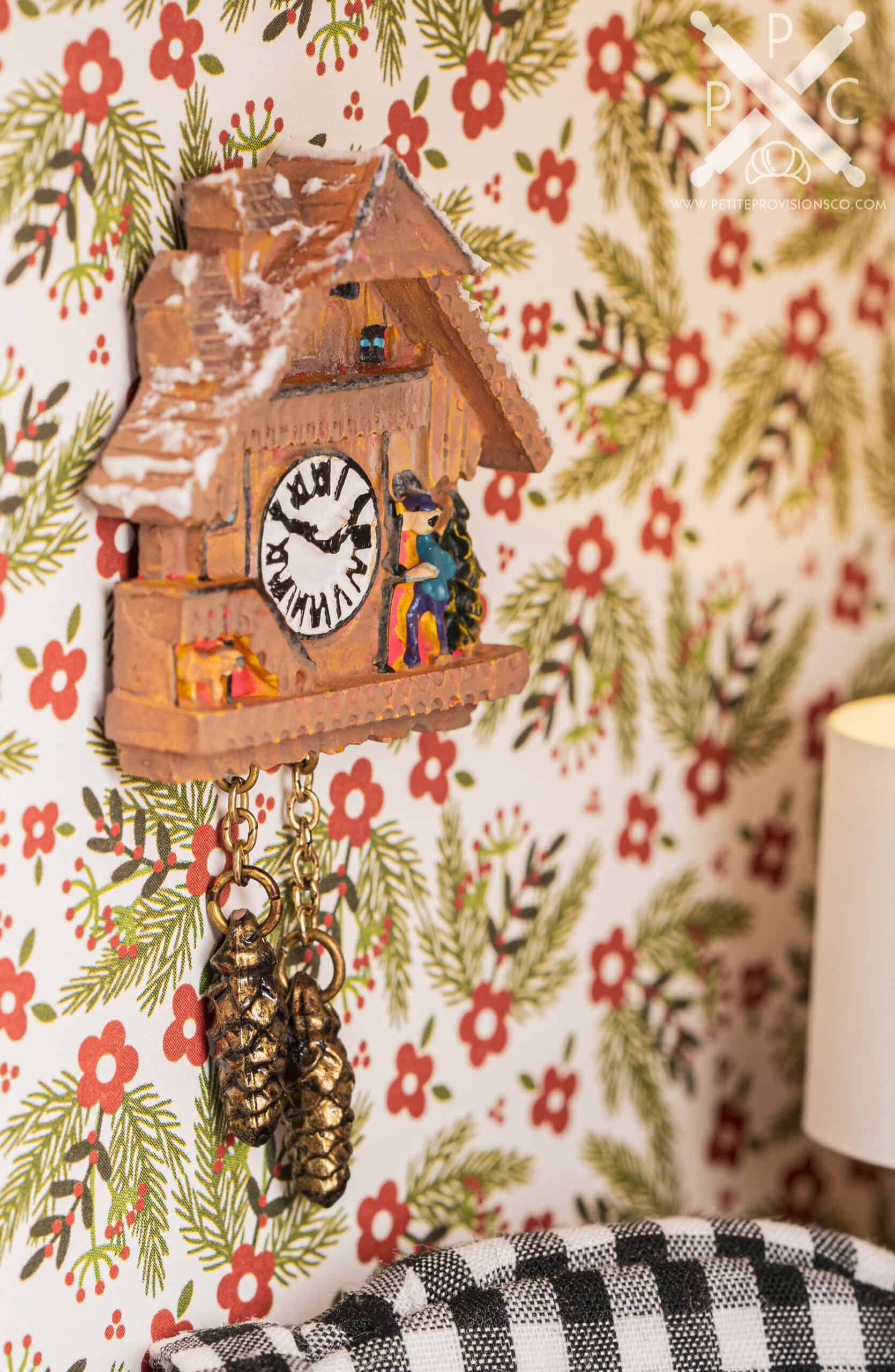 The cuckoo clock is by Reutter Porzellan and was repainted and lightly customized with faux snow along the roofline. Those small modifications really helped transform it into a festive holiday accent.