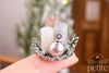 Elevate any dollhouse holiday display with this shimmering, muted metallic winter candle centerpiece. Three miniature pillar candles in pearl white, soft bronze-rose, and frosted silver stand clustered together on an ornate silver tray. Surrounding them is a ring of snow-tipped evergreen sprigs, adding a natural, wintry texture.