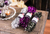 – 3 handmade packages of tinsel garland in purple, silver, and black