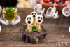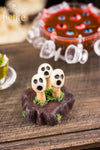 Straight from the shadowy corners of an enchanted forest, this one-of-a-kind Halloween sculpture captures a trio of haunted mushrooms caught mid-scream. Each mushroom cap is hand-sculpted from polymer clay, their wide-eyed expressions painted with eerie black detail, and they sprout from a gnarled, textured stump accented with mossy greenery.