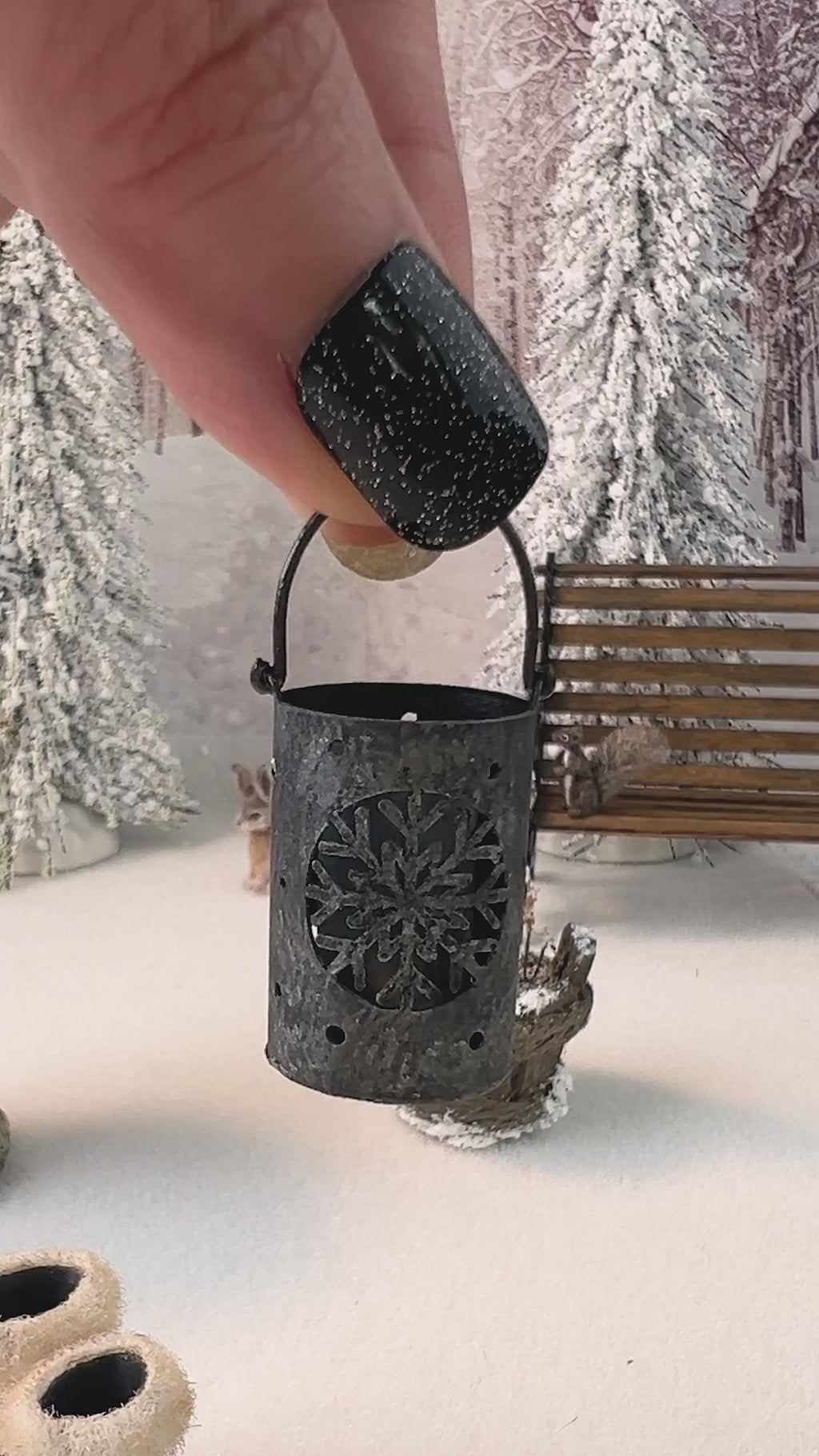 A delicate snowflake cutout wraps the lantern body, allowing soft candlelight to shine through and cast a cozy glow against snowy surroundings. Inside, a magnet-operated LED light provides gentle illumination without visible wiring, making this piece easy to style in a variety of winter vignettes — from porches and pathways to garden corners and woodland scenes.