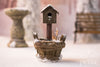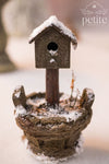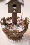 This one-of-a-kind winter birdhouse brings a quiet, timeworn charm to miniature garden and porch scenes. Mounted in a rustic planter-style base, the birdhouse features weathered textures, subtle mossy undertones, and a snow-dusted roof with a delicate icicle forming along the eave.